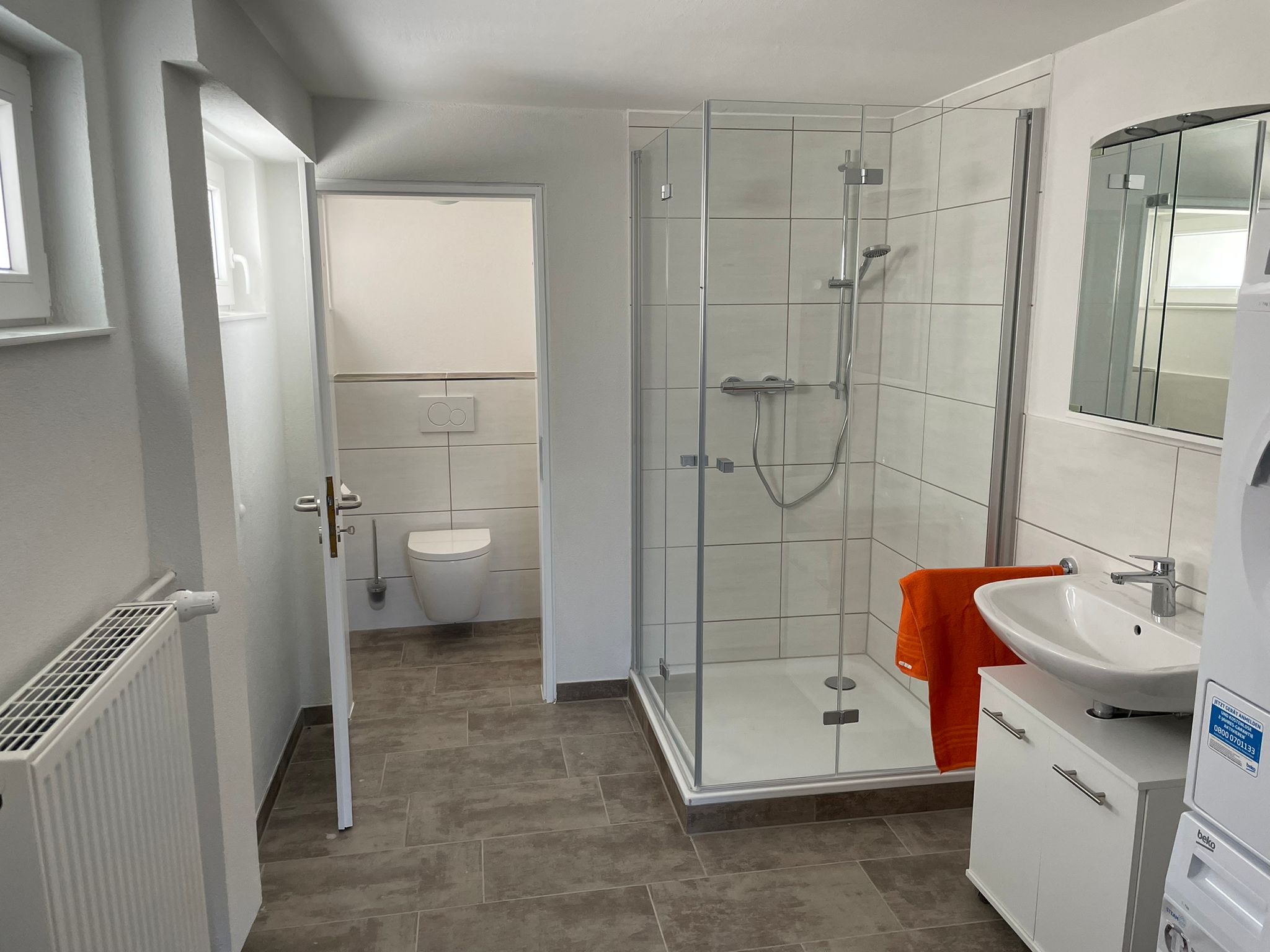 - Terasse mit Sitzgelegenheit und Sonnenschirm